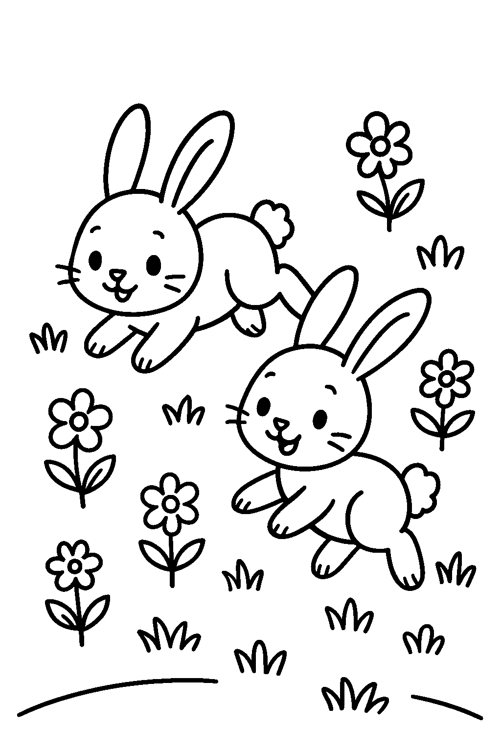 Free Playful Rabbits in Flowery Meadow Coloring Page