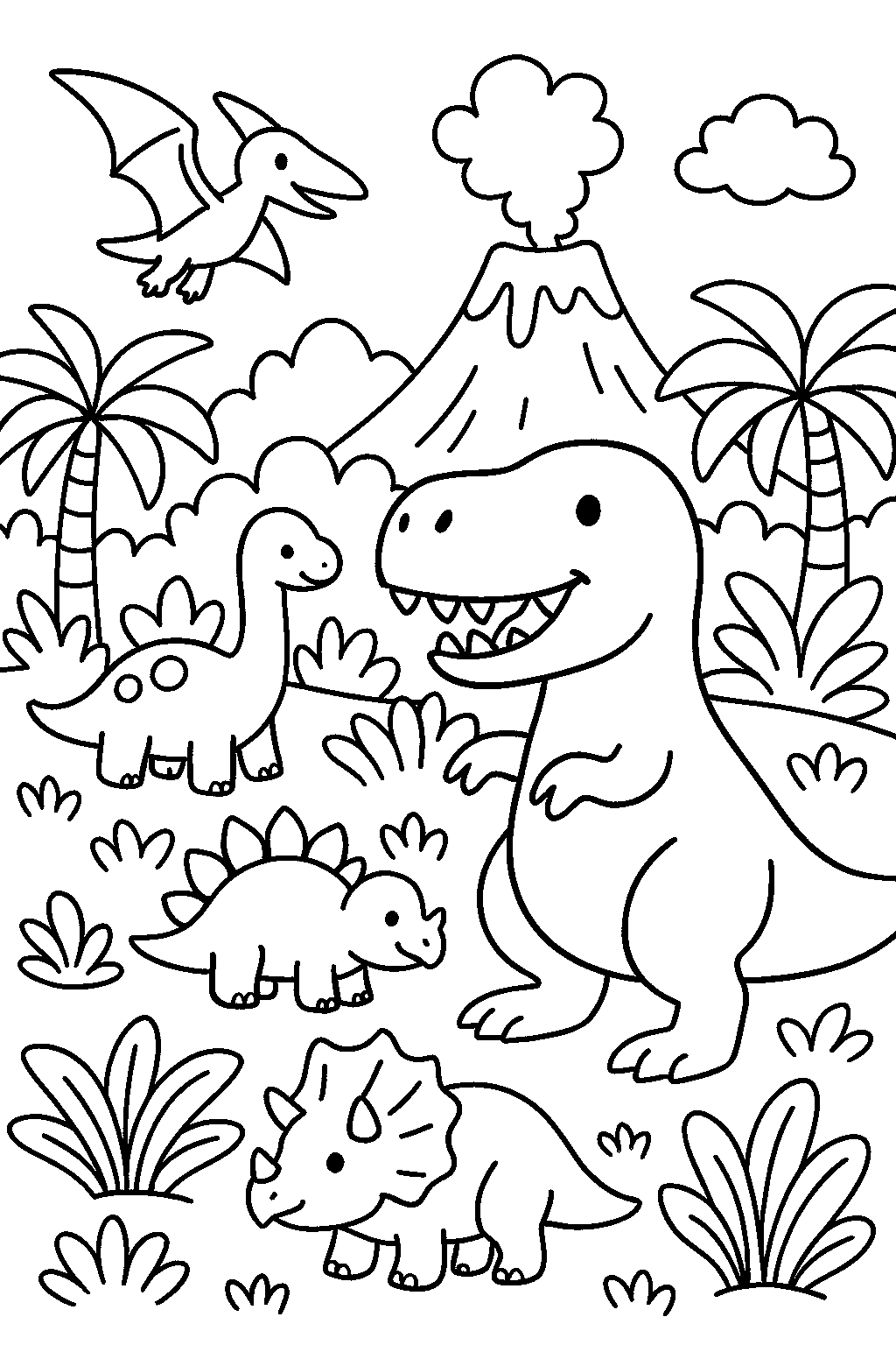 Embark on a thrilling prehistoric adventure with our ‘T-Rex Roaring by Jungle Volcano’ coloring page. This captivating scene features a majestic T-Rex, the king of dinosaurs, roaring proudly amidst a lush jungle backdrop. Kids will be fascinated by the realistic details, from the towering trees to the diverse array of dinosaurs that accompany the T-Rex in its natural habitat. In the distance, a dramatic volcano adds an element of excitement, as it looms over the vibrant landscape, ready to spark imaginations. This coloring page is perfect for young dinosaur enthusiasts eager to explore the ancient world through art. As they fill in each detail with their favorite colors, children can unleash their creativity while learning about the grandeur of these magnificent creatures. The combination of the T-Rex, other dinosaurs, and the stunning volcanic scenery makes for a truly engaging coloring experience. Don’t miss the chance to bring this dynamic dinosaur safari to life. Download and print this free coloring page today to let your child’s imagination roar as loud as the mighty T-Rex!
